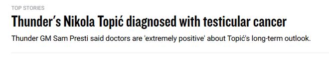 北京時(shí)間10月31日,此前,球迷們只知道雷霆后衛(wèi)托皮奇接受了一項(xiàng)與睪丸相關(guān)的手術(shù),但并不清楚具體情況。雷霆總經(jīng)理普雷斯蒂今日官宣了托皮奇的癌癥診斷結(jié)果,真相才得以公布。
