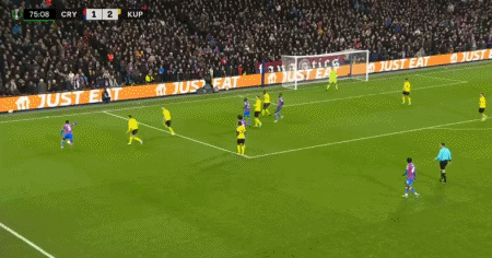 第76分鐘,米切爾傳中,德文尼破門將比分扳平,水晶宮2-2古比斯